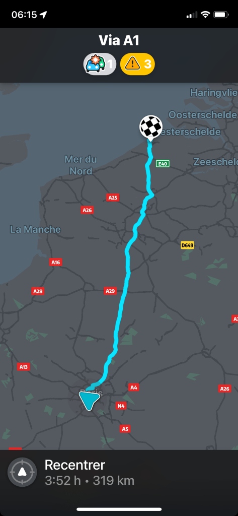 Départ 6 heures du matin pour Zeebrugges !!! En gros, faut aller tout droit vers le nord.