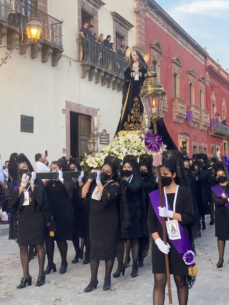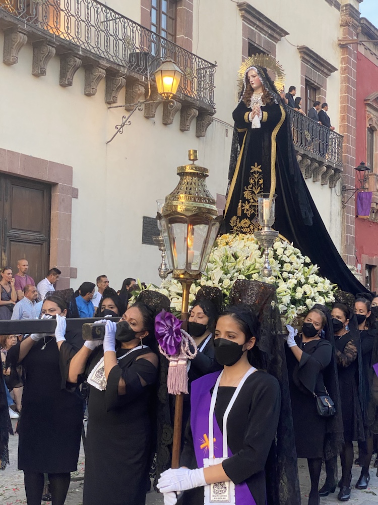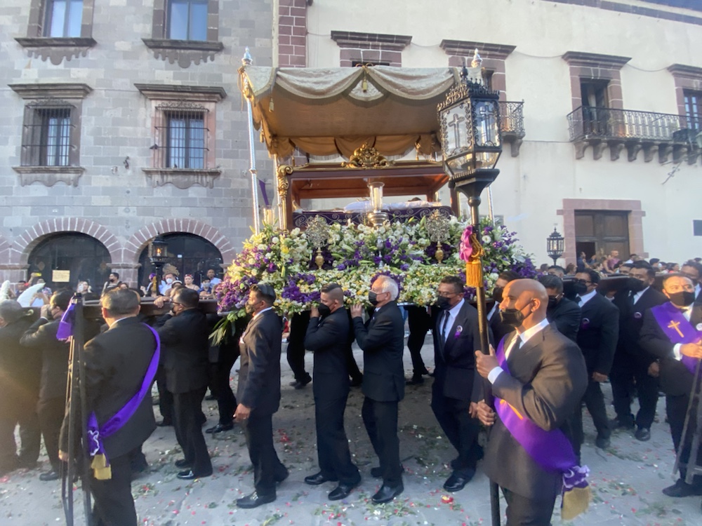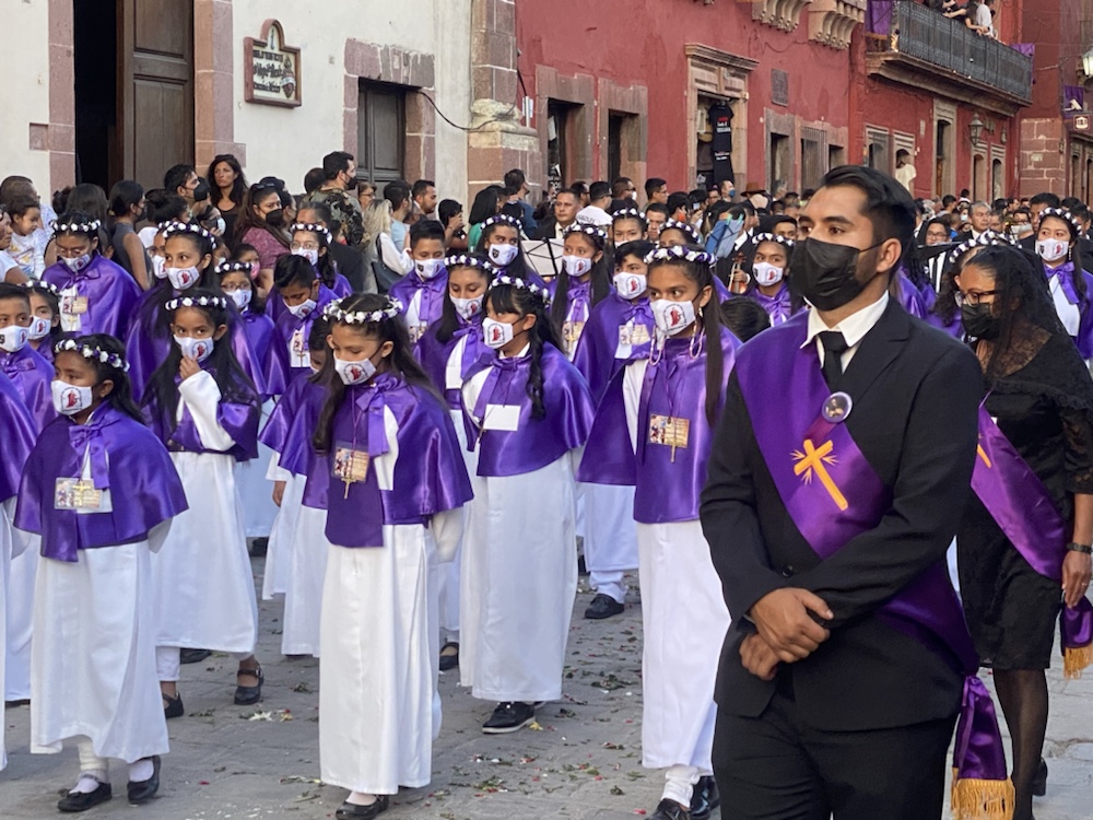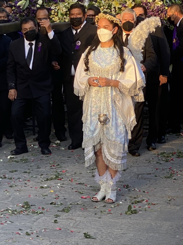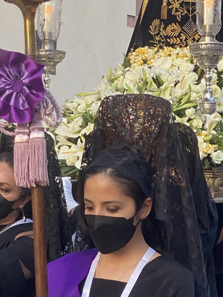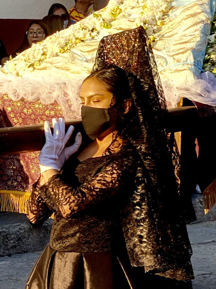 Et le vendredi, nous avons participé à la procession du silence. Les rues étaient déjà bondées pendant la journée (c’est la semaine de vacances classique des mexicains) mais le soir, les rues sont noires de monde pour voir passer la procession. Tout le monde doit garder le silence et avoir la tête nue. Un service d’ordre y veille.