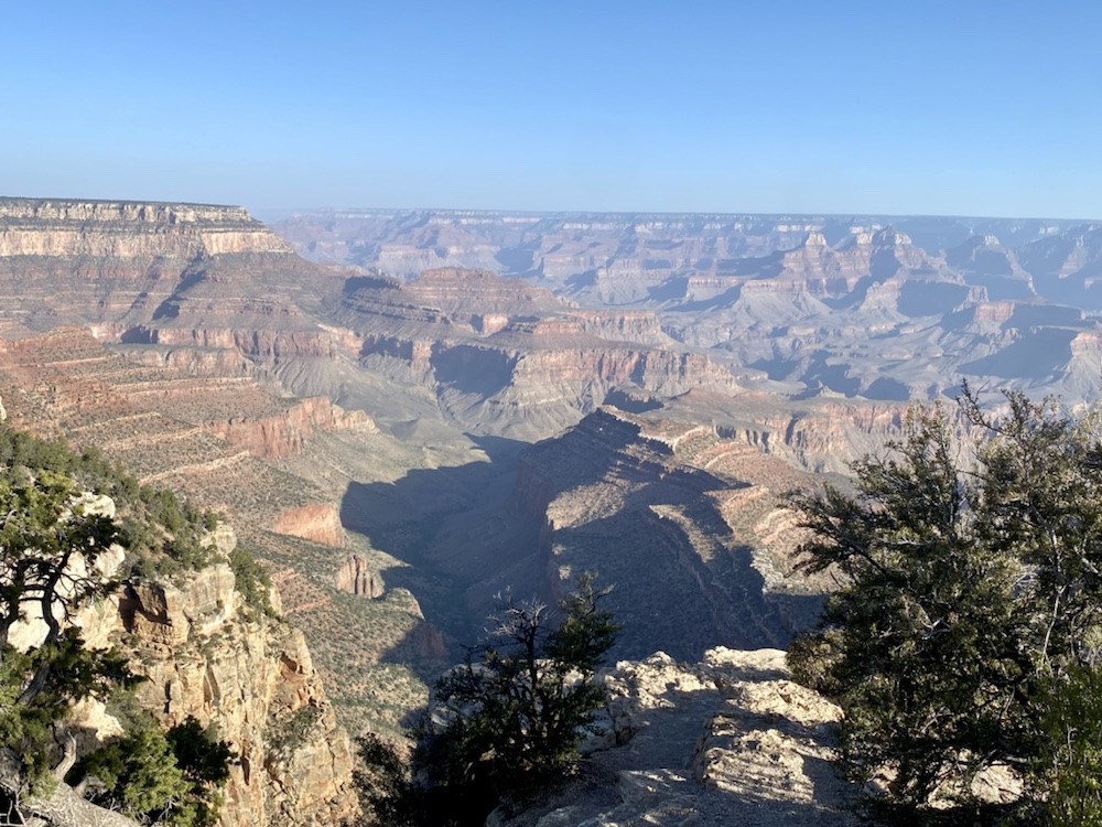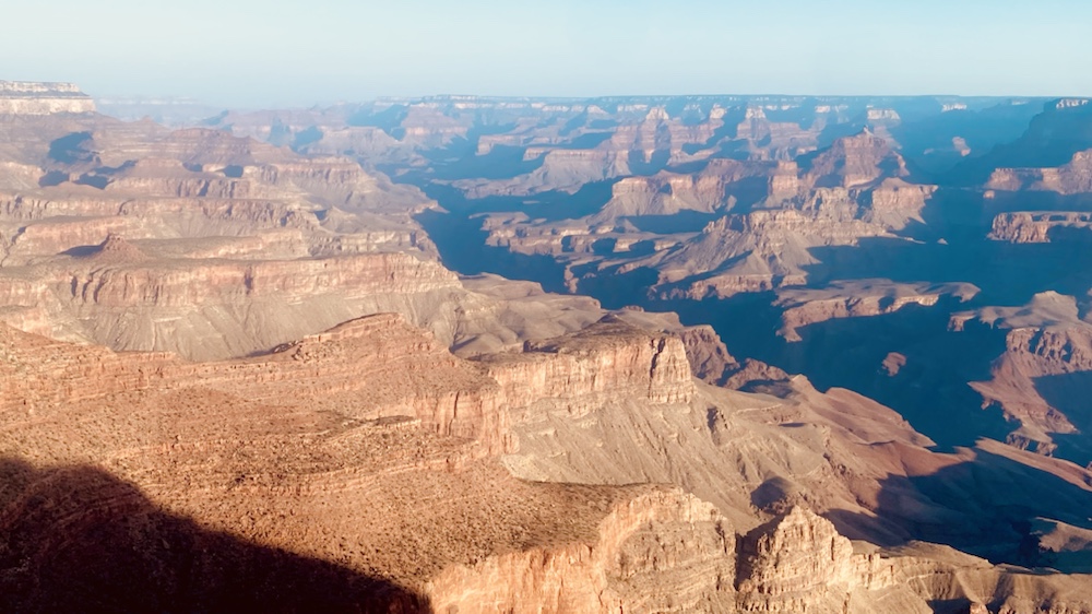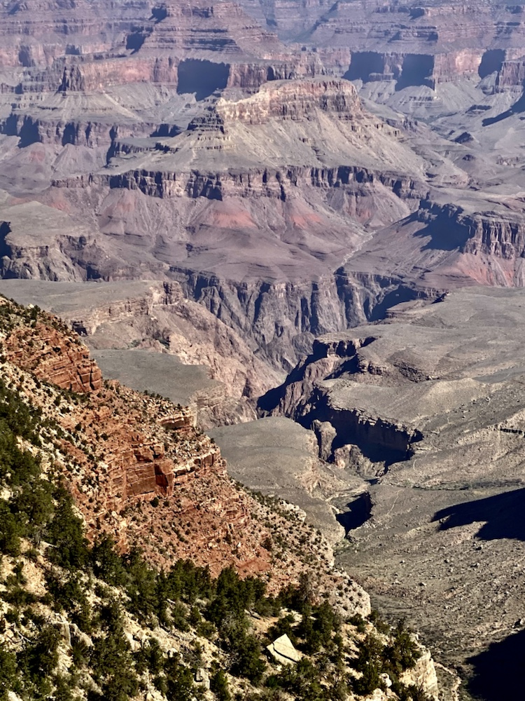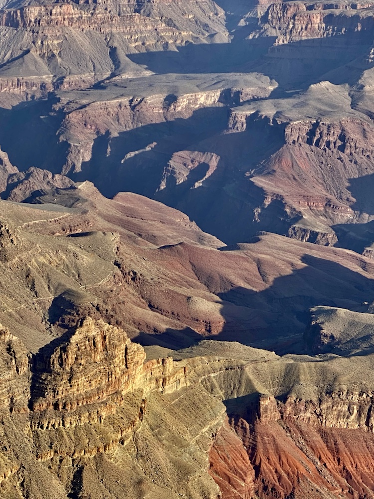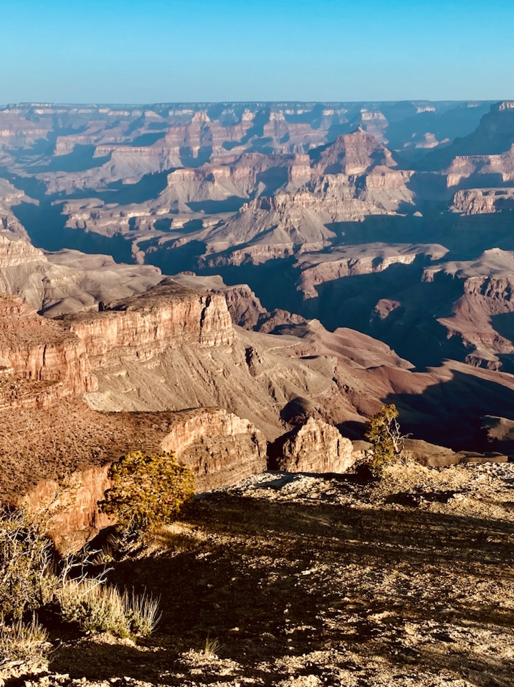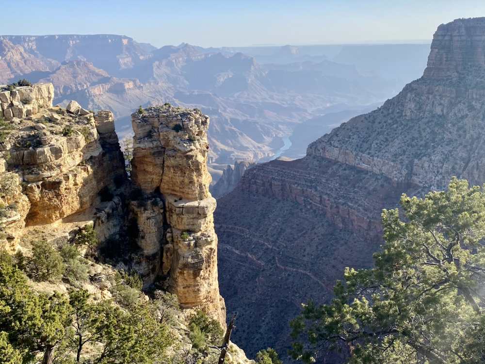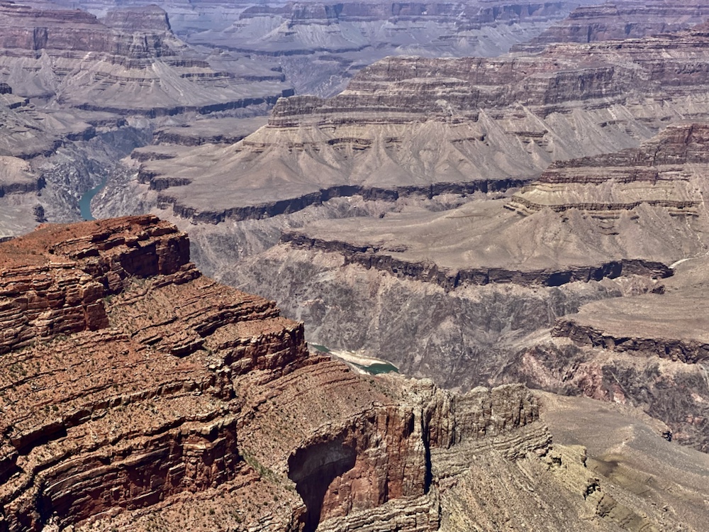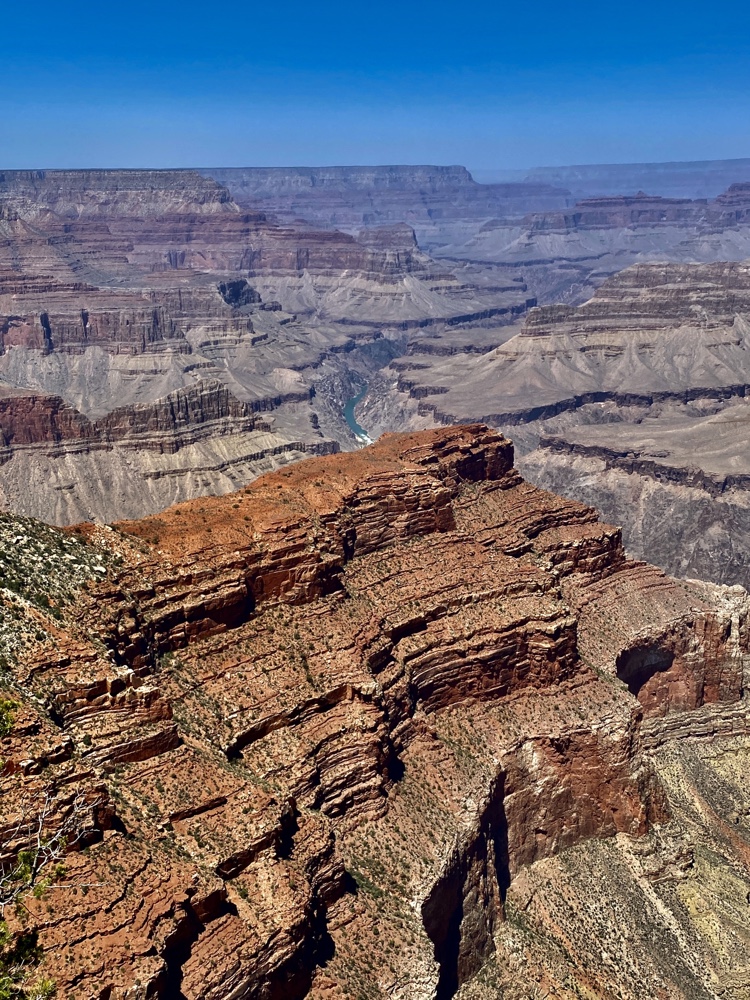 Nos yeux se perdent dans l’immensité de cette brisure, cette cicatrice immense et inquiétante. Des couleurs sombres. Ocres et grises. Une brume légère au fond des crevasses le rend plus mystique encore. Le fleuve, le Colorado, au fond de falaises abruptes de 1800m de haut, paraît si insignifiant à la vue de ses conséquences au bout de quelques millions d’années. Vu d’en haut, on dirait un ruisseau….