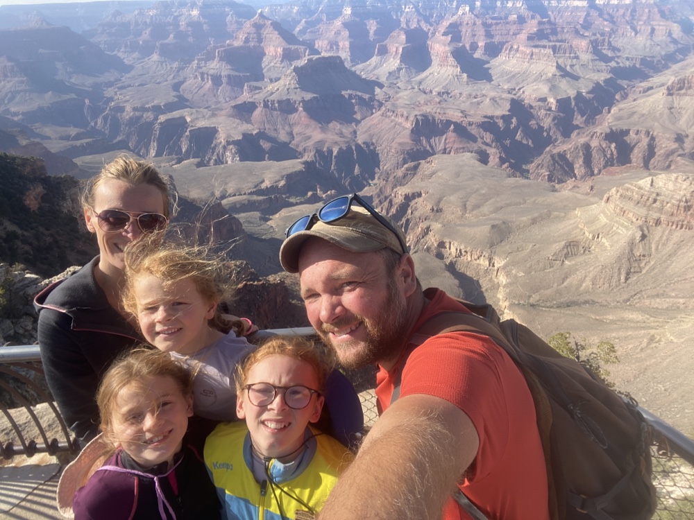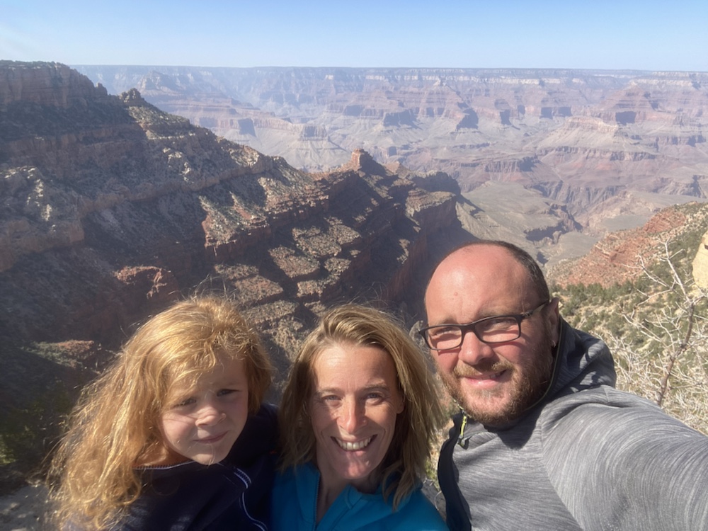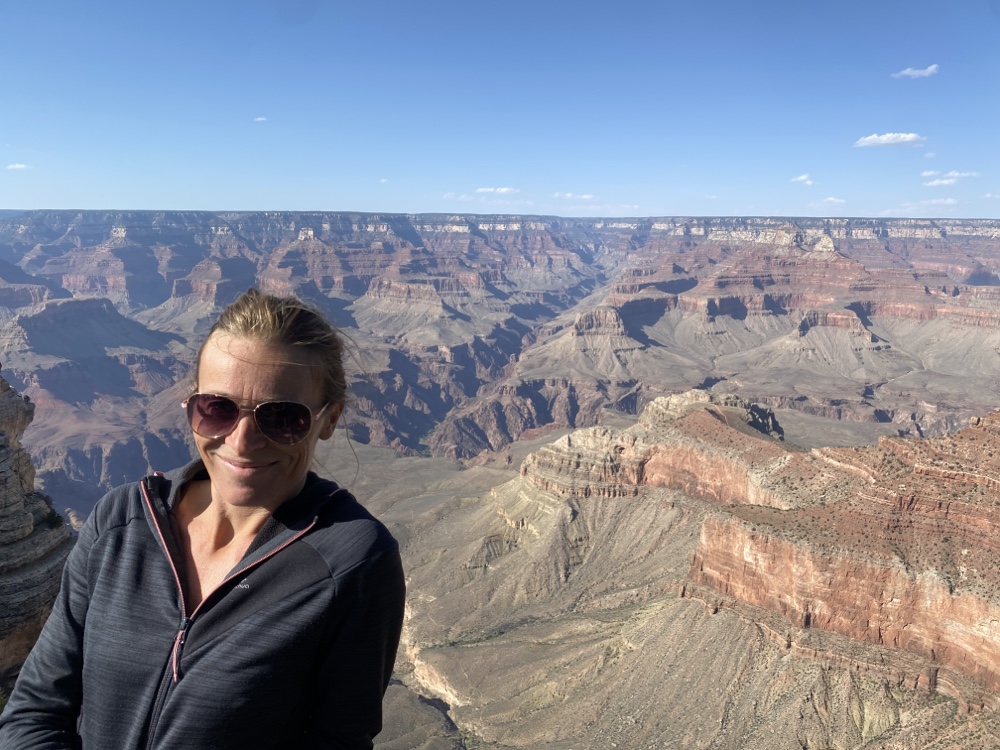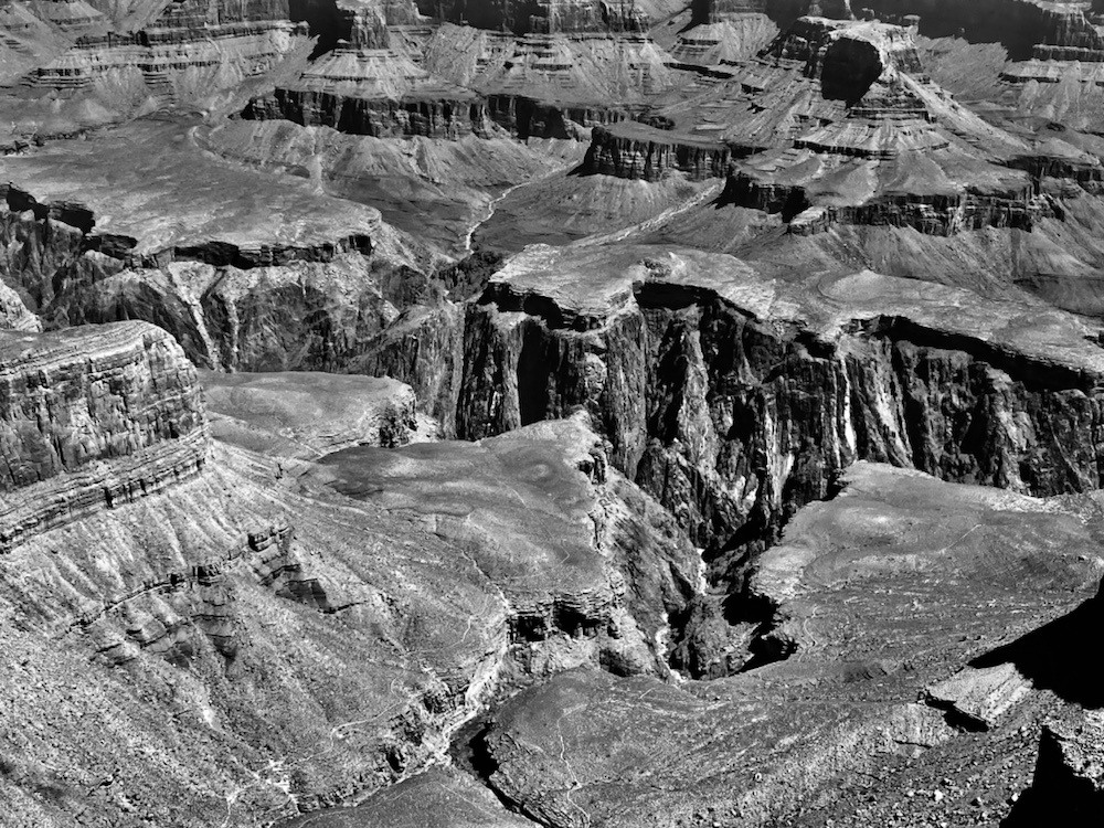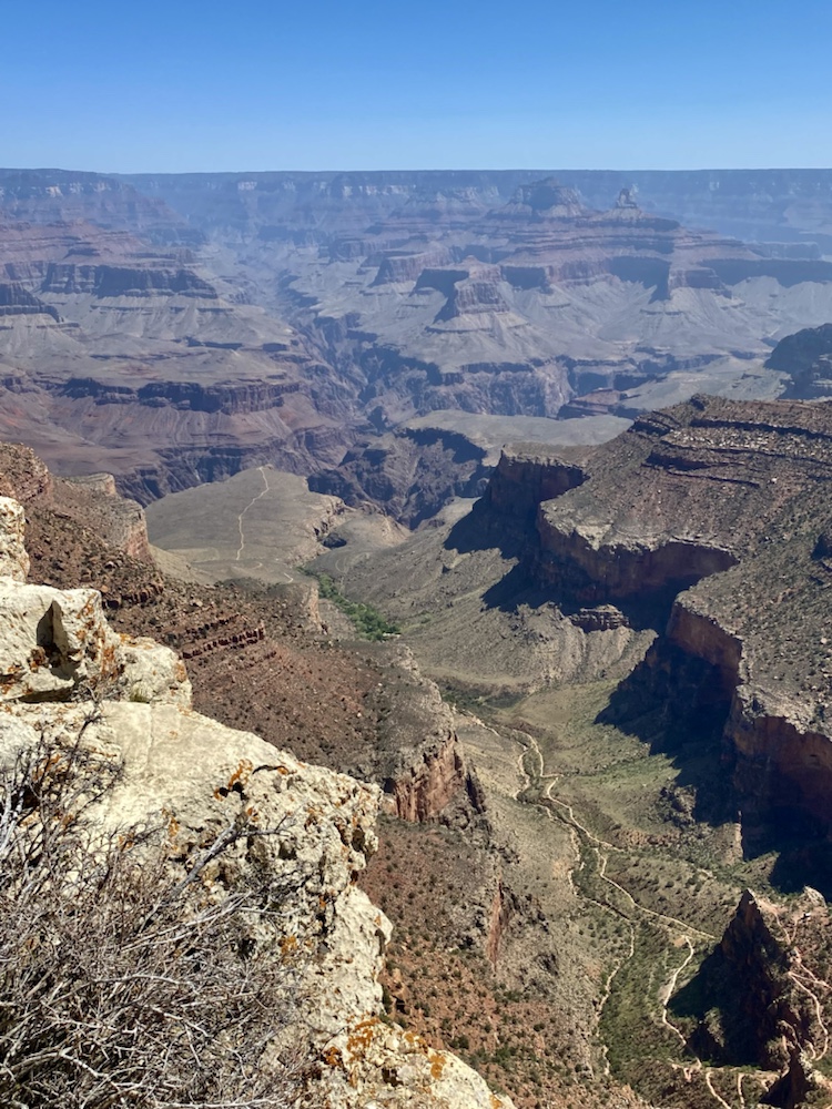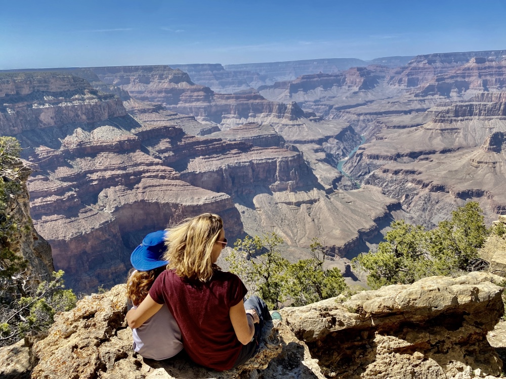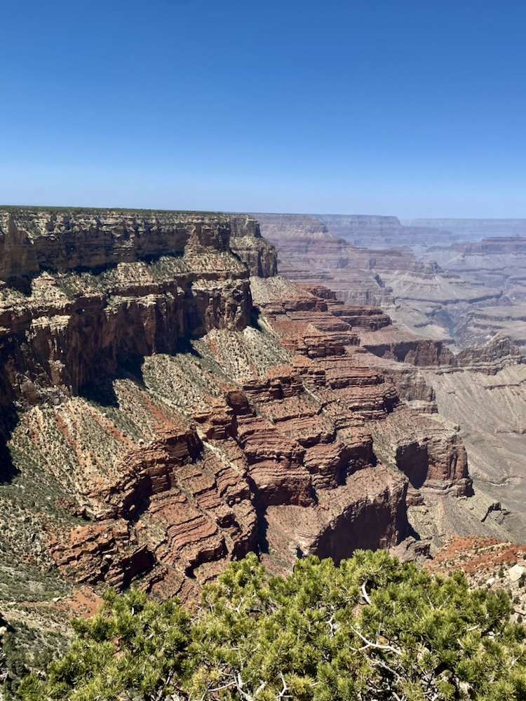 Nos yeux se perdent dans l’immensité de cette brisure, cette cicatrice immense et inquiétante. Des couleurs sombres. Ocres et grises. Une brume légère au fond des crevasses le rend plus mystique encore. Le fleuve, le Colorado, au fond de falaises abruptes de 1800m de haut, paraît si insignifiant à la vue de ses conséquences au bout de quelques millions d’années. Vu d’en haut, on dirait un ruisseau….
