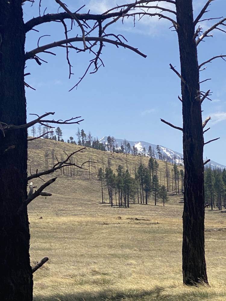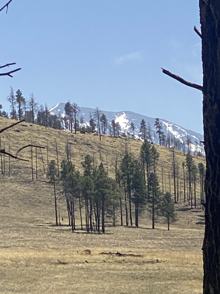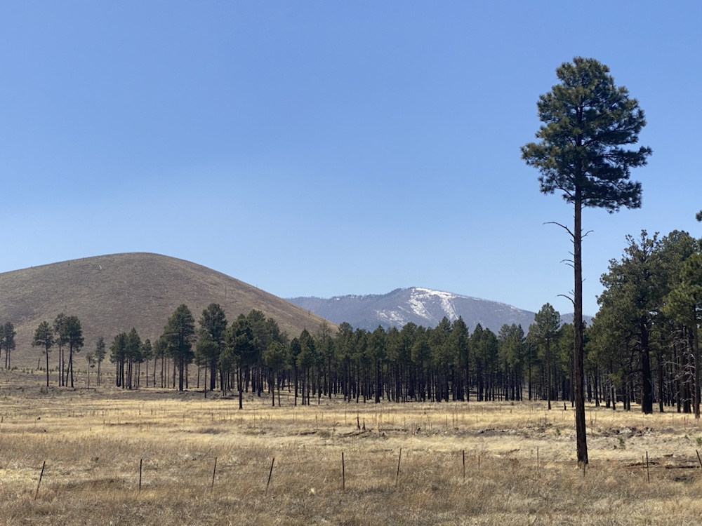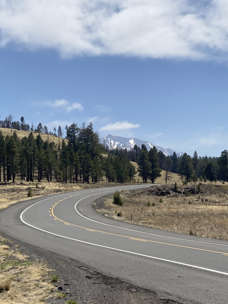 La route monte de Flagstaff dans des décors majestueux, des sommets enneigés à l’horizon.
