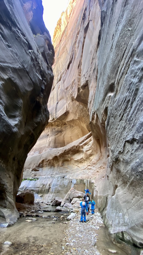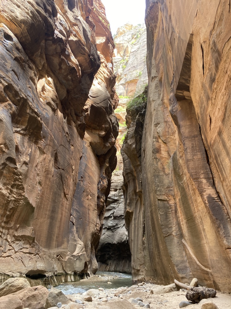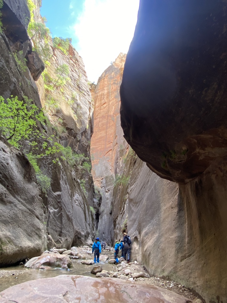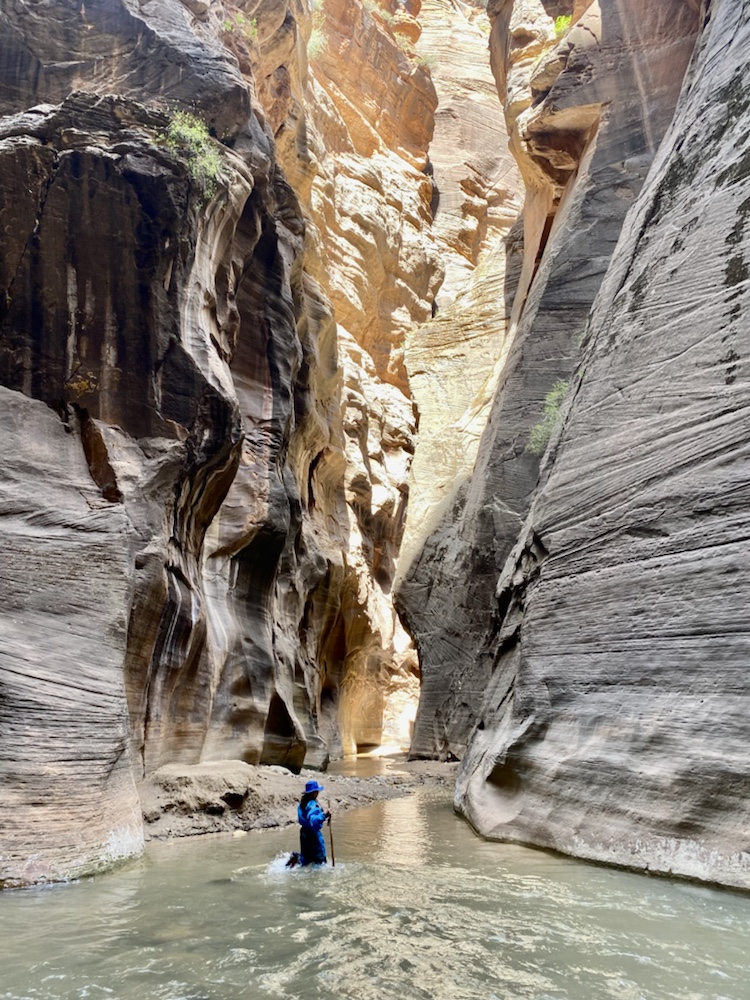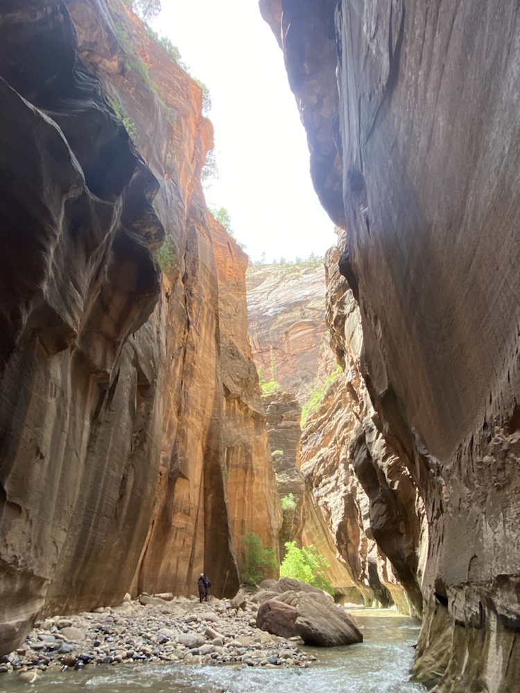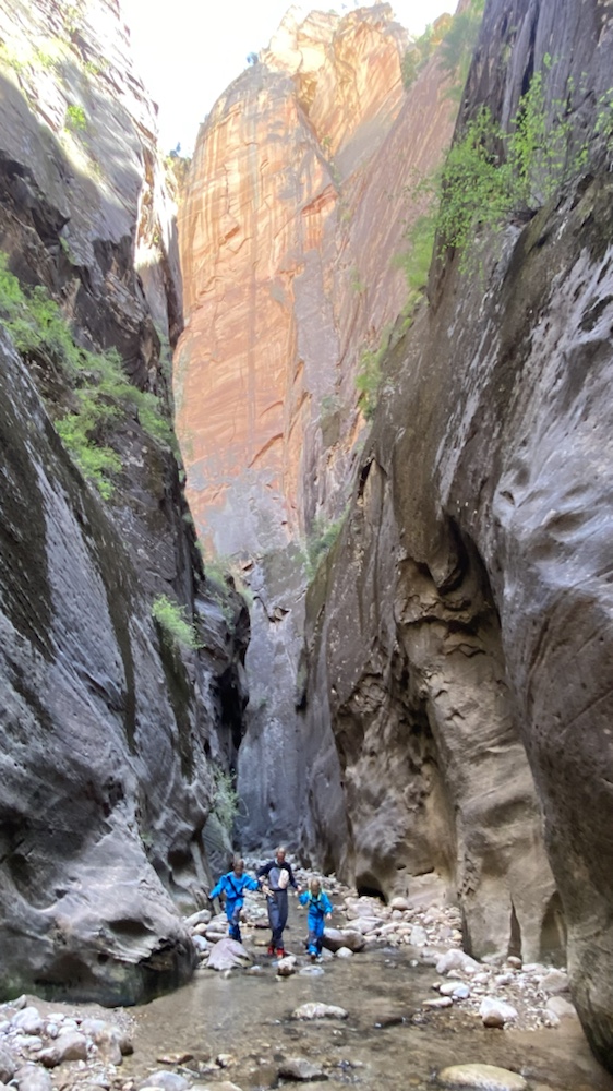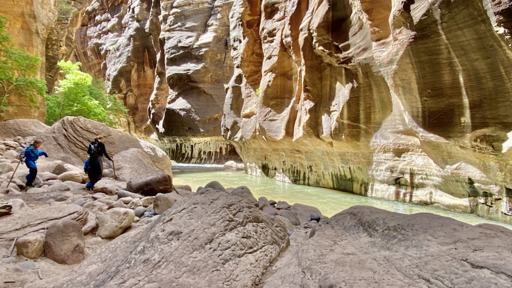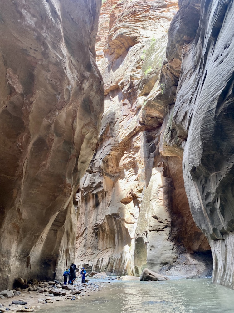 On remonte le courant sur plusieurs miles. On traverse des multiples fois la rivière pour avancer en terrain sec. On lutte contre les rapides. On glisse sur les cailloux. On se faufile entre les parois du canyon de plus en plus étroites ( d’où le nom the narrows)