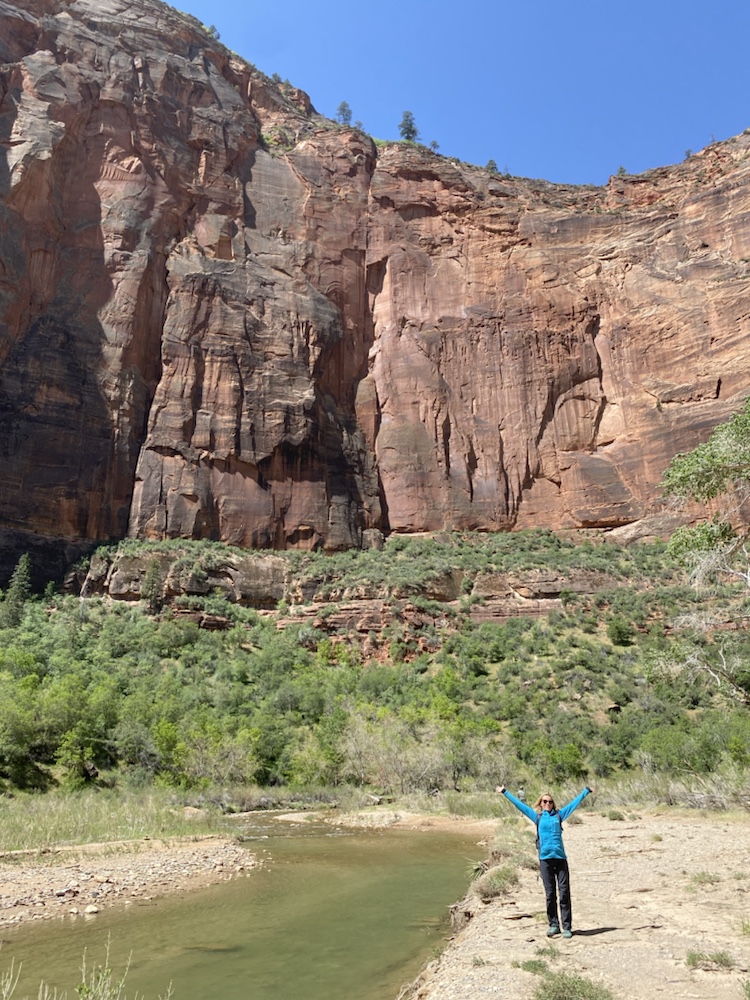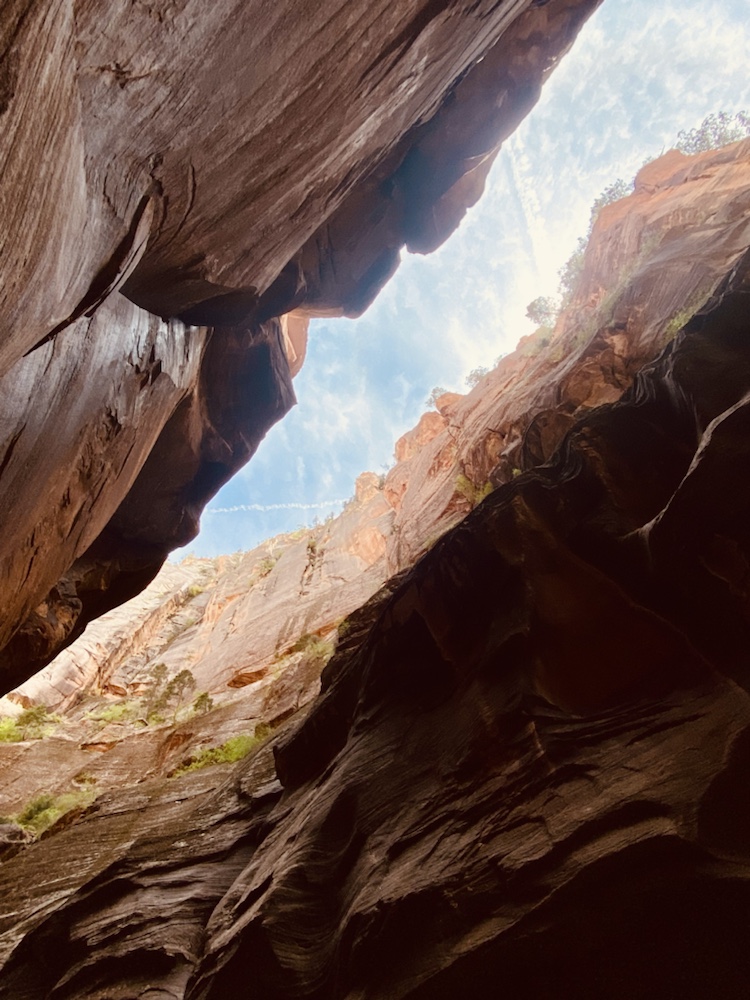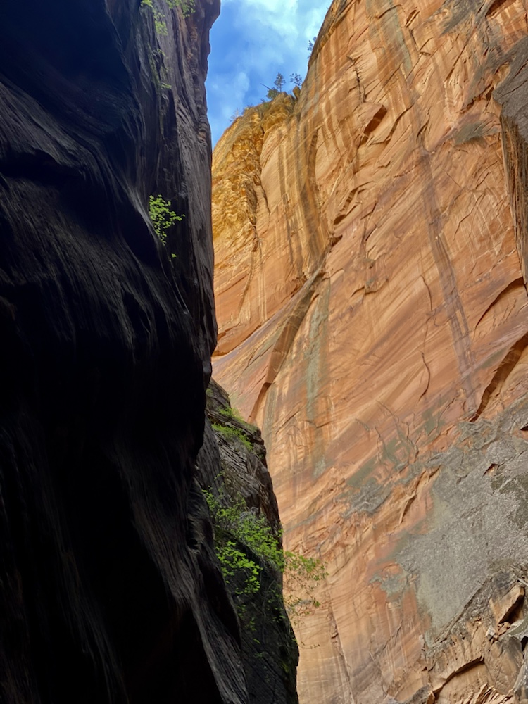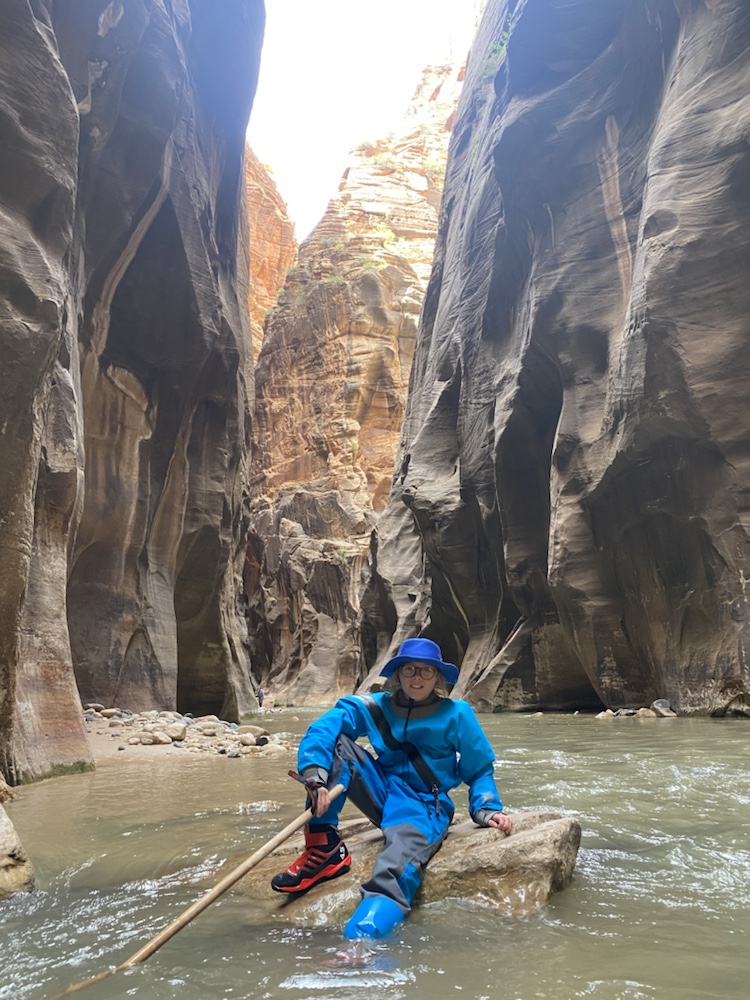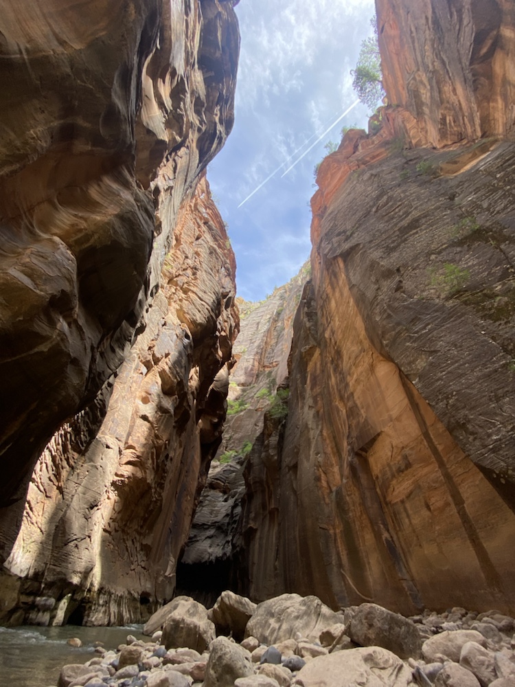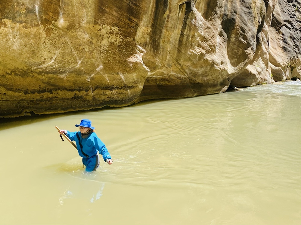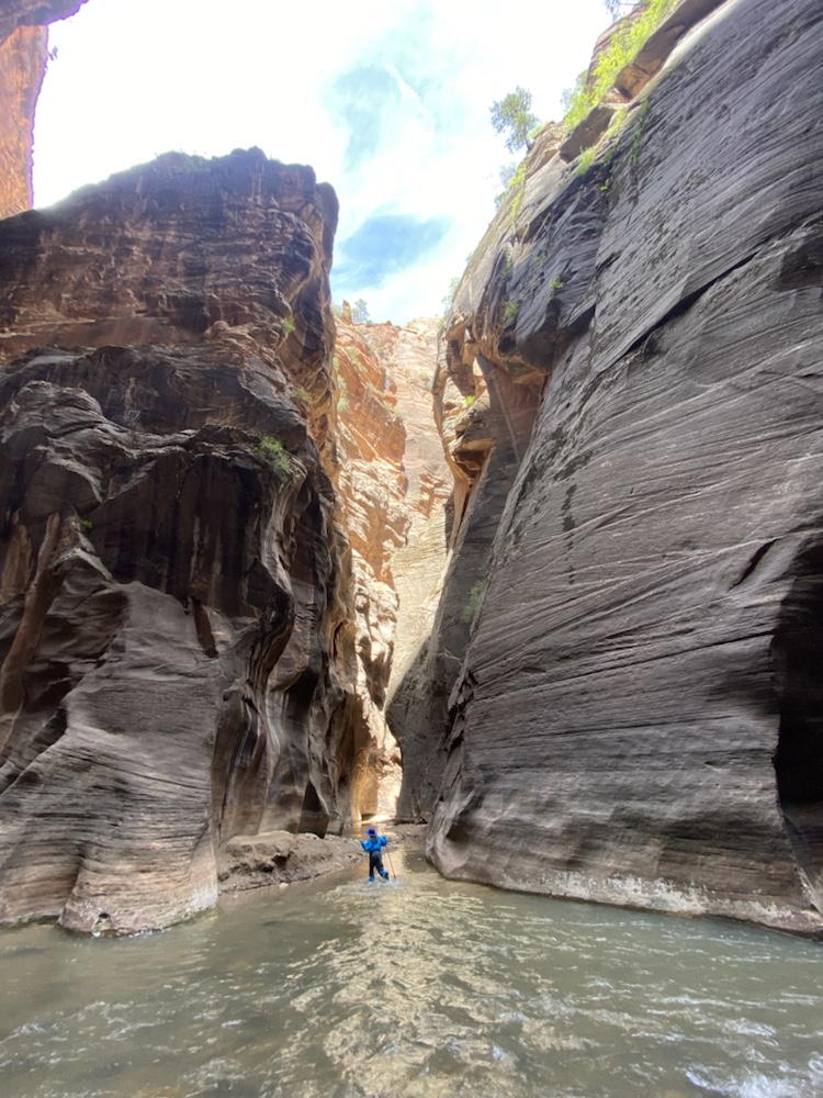 On remonte le courant sur plusieurs miles. On traverse des multiples fois la rivière pour avancer en terrain sec. On lutte contre les rapides. On glisse sur les cailloux. On se faufile entre les parois du canyon de plus en plus étroites ( d’où le nom the narrows)