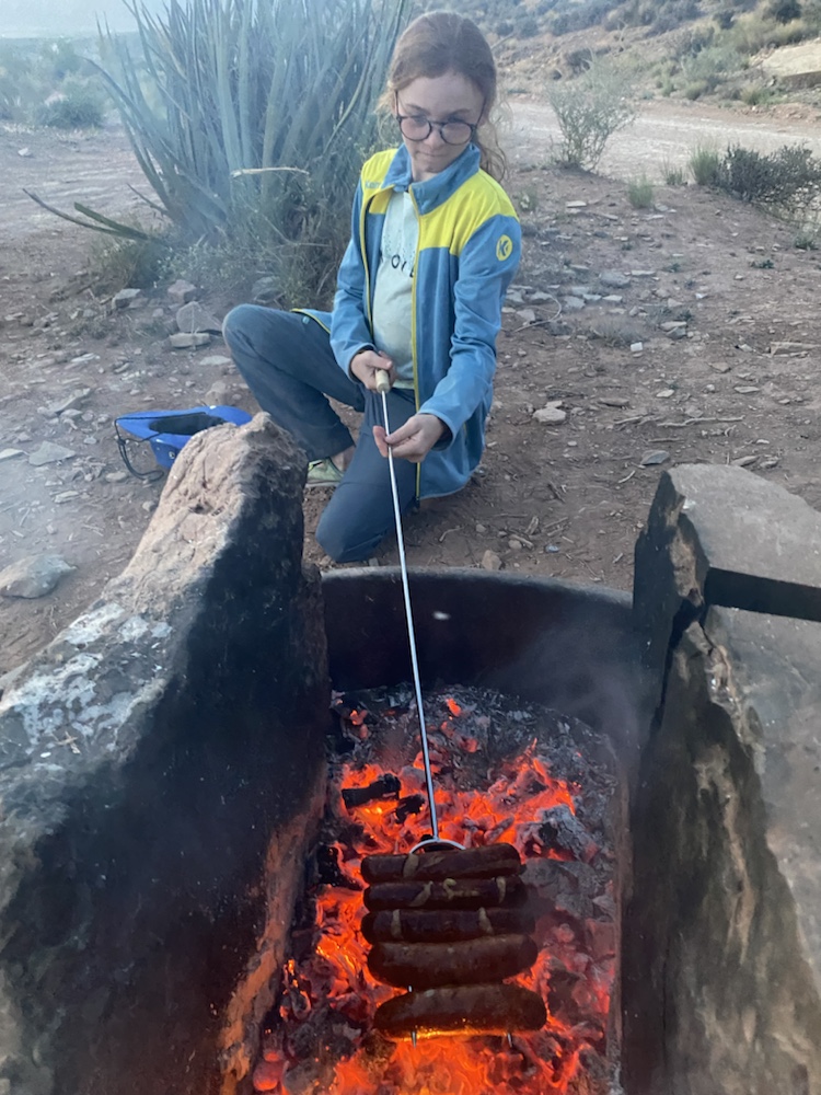 L’avantage, c’est que par le froid qu’il fait, on se réchauffe au coin du feu. au menu, saucisse et chamallows !