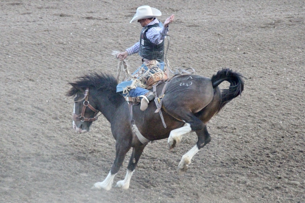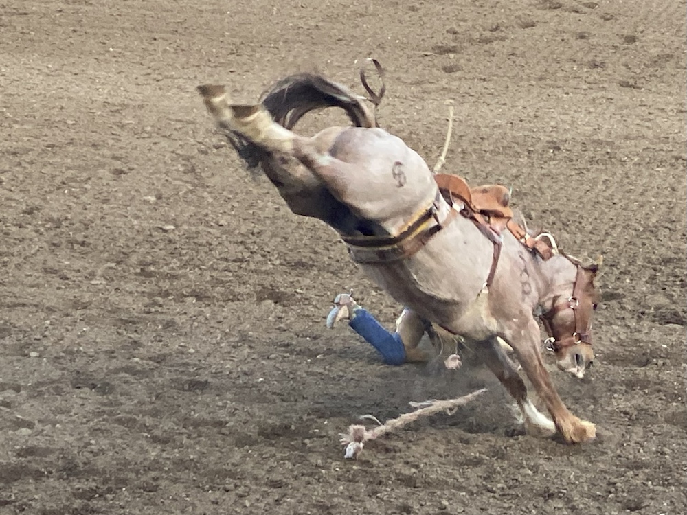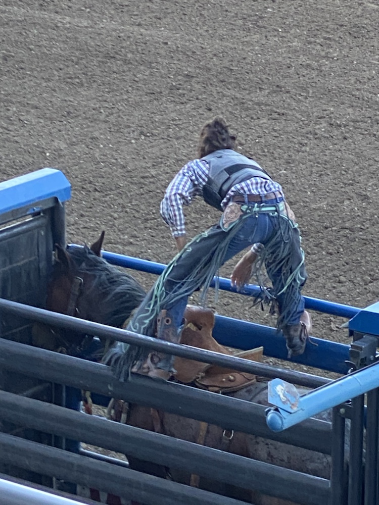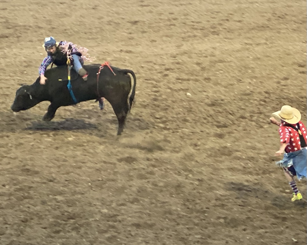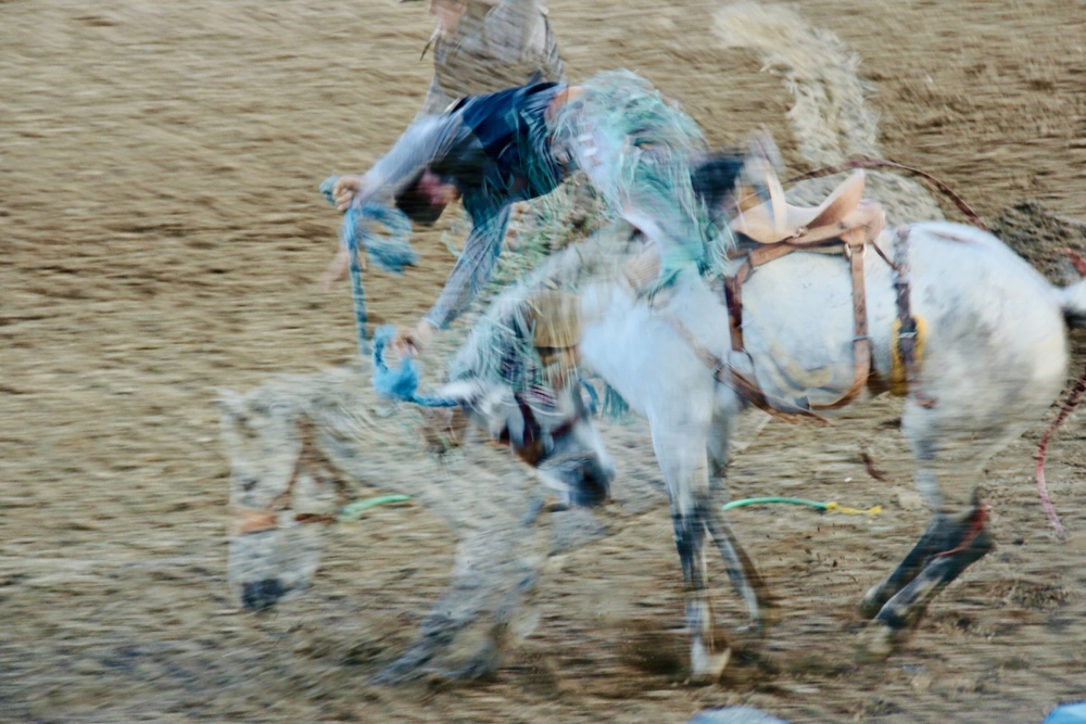 Et enfin, en dernière épreuve, le rodéo sur taureau fou. Plusieurs catégories mais globalement le cow-boy finit par terre. Sauf un…. Le taureau devait avoir la sangle moins serrée. Oui parce qu’ils y mettent encore une sangle …. Promis, ils disent que c’est pas sur les roubignoles mais ça semble gêner quand même.
