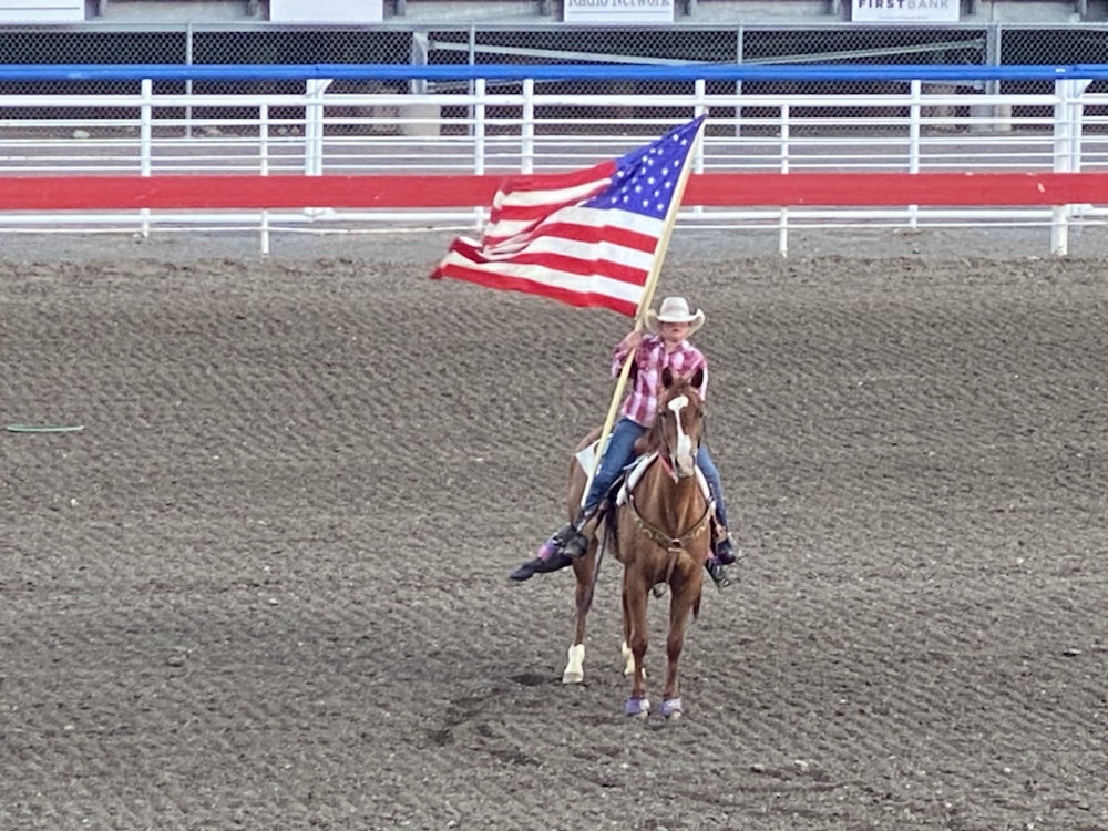 Le défilé du drapeau. Porté en étendard par une fille au port altier sur son cheval au galop. Et l’hymne national.
