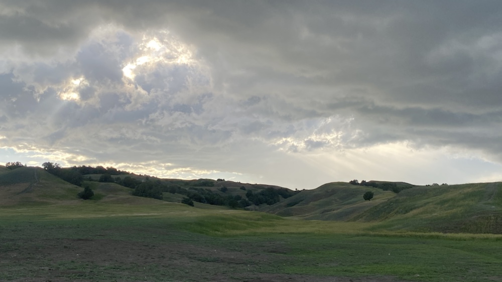 Paysage Vert. Herbes rases. Collines douces et orages de malades. Dont un qui nous a obligé de nous arrêter au bord de l’autoroute tellement on pensait que roro allait s’envoler ou s’écraser sur le côté…. (d’ailleurs roro a vraiment un problème d’étanchéité les jours d’orage. Faudra regarder ça au retour! Il fuit !!)