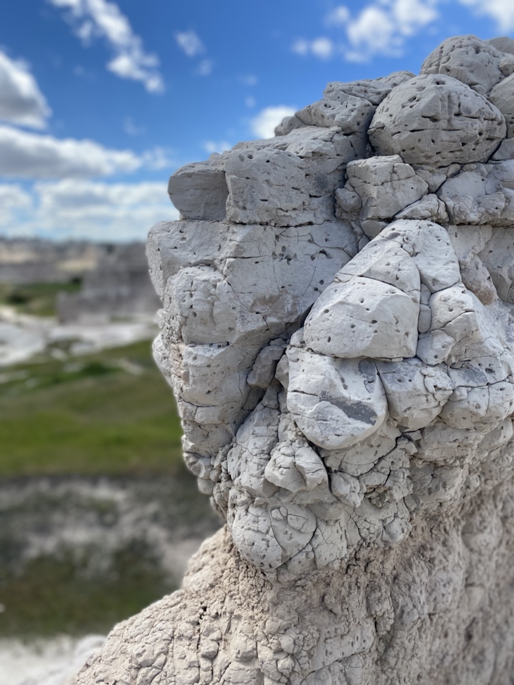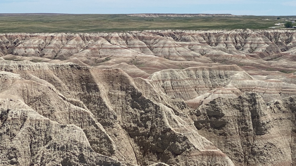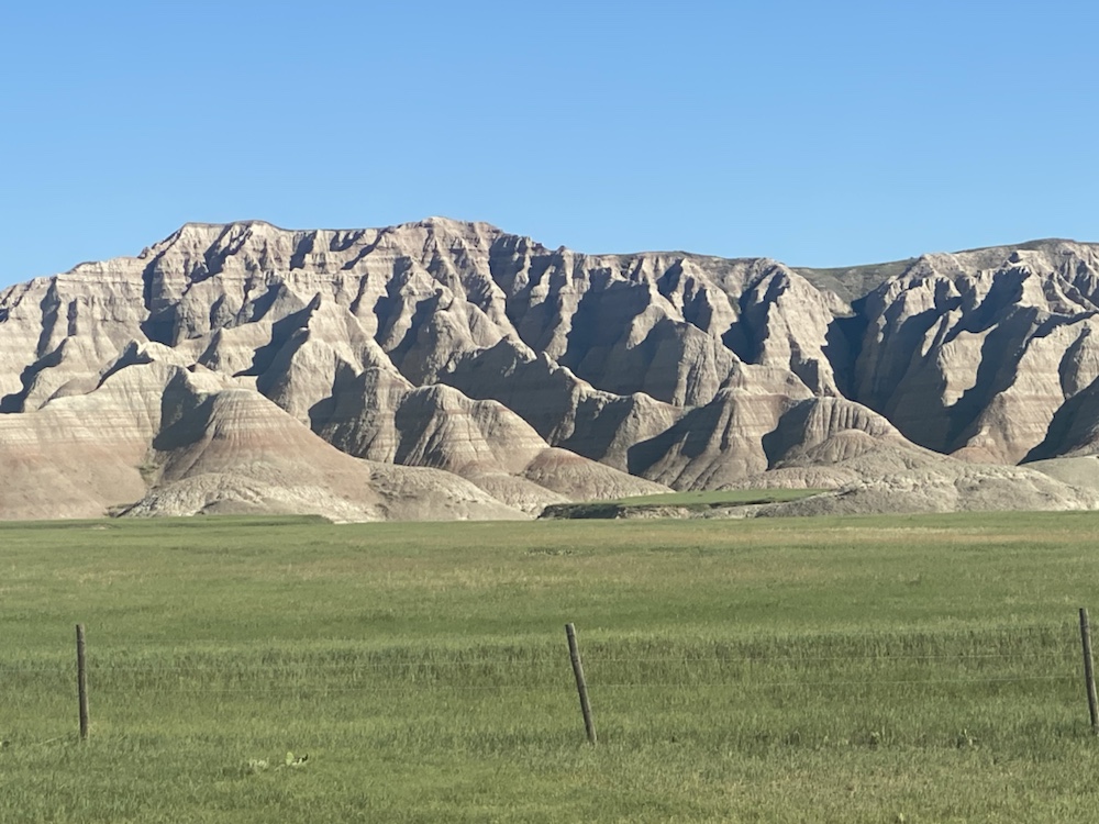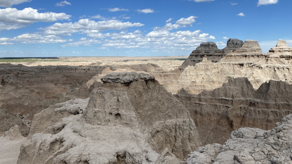 Dents acérées de roche friable s’étendant dans une mer d’herbe à bison et chien de prairie.