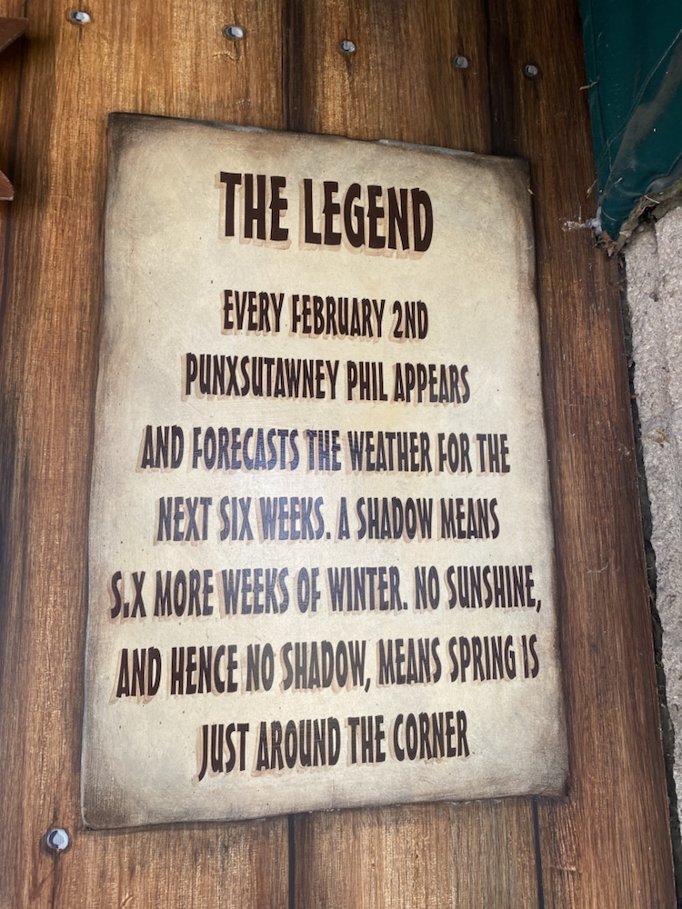 Une nuit dans la vraie ville de la marmotte qui annonce +\- la fin de l’hiver sur du film de un jour dans fin… veux qui l’ont vu reconnaîtront le personnage. Par contre ne me demandez pas le nom du bled…. C’est juste imprononçable