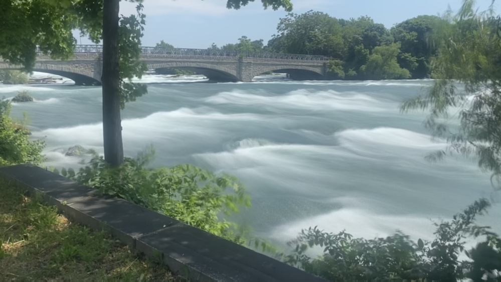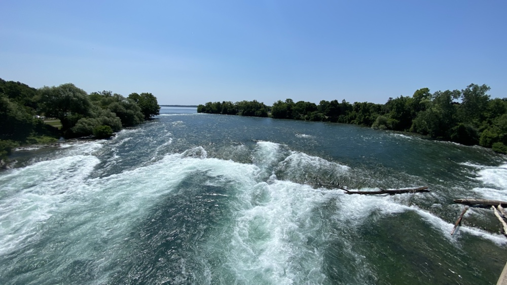 Cote américain, on longe une rivière large comme la Loire, tourbillonnante et bruyante. On a presque envie de se tremper… mais ça serait une mauvaise idée.