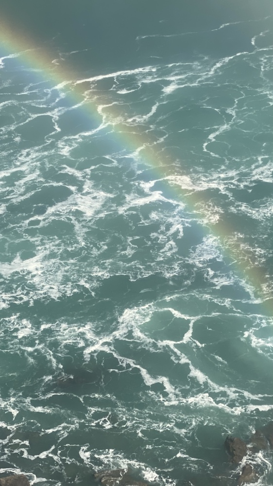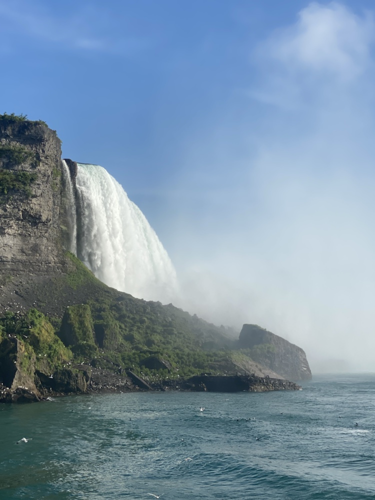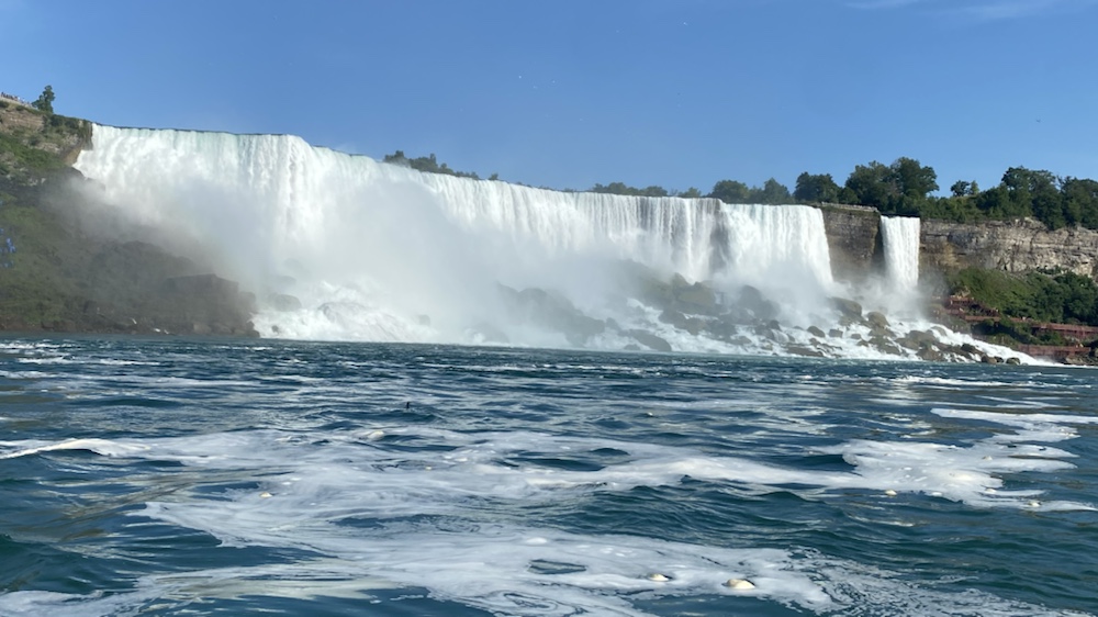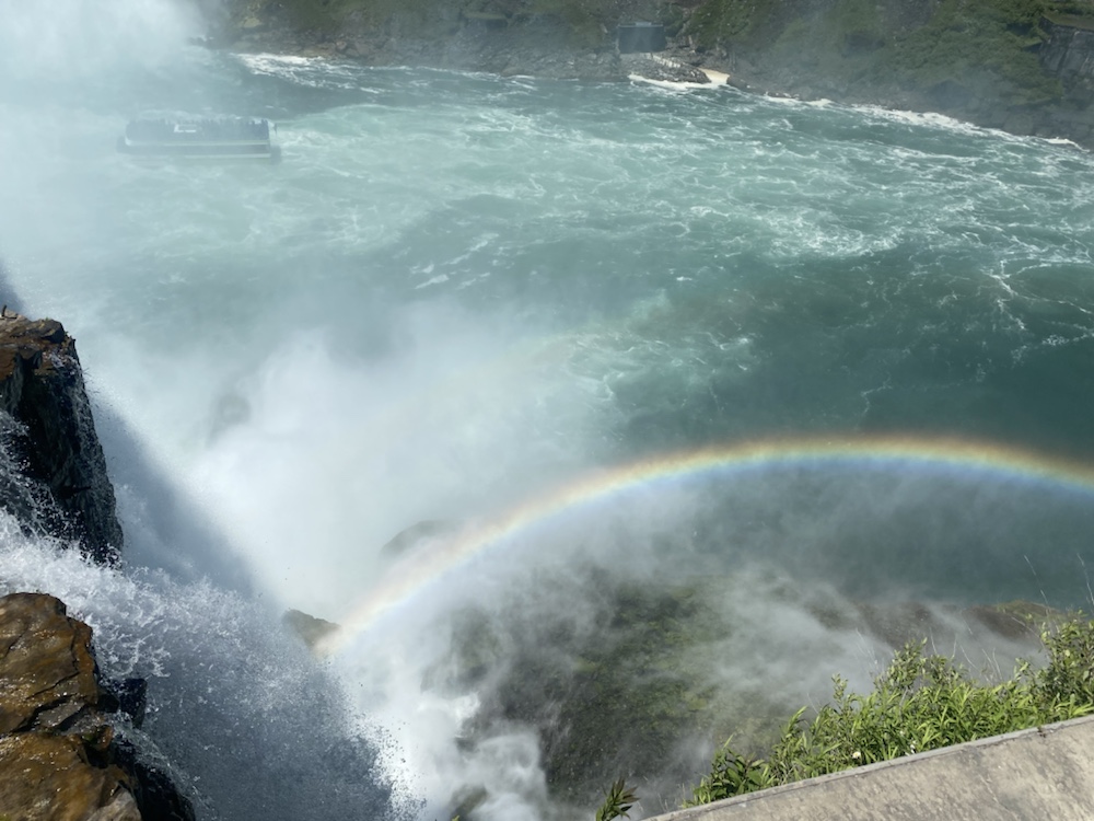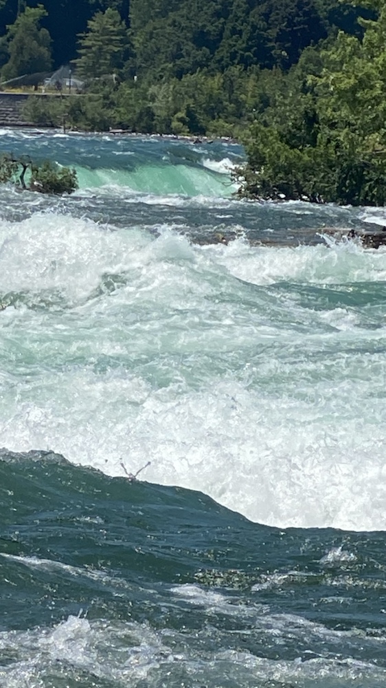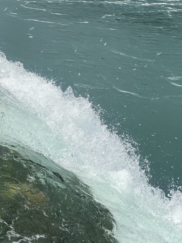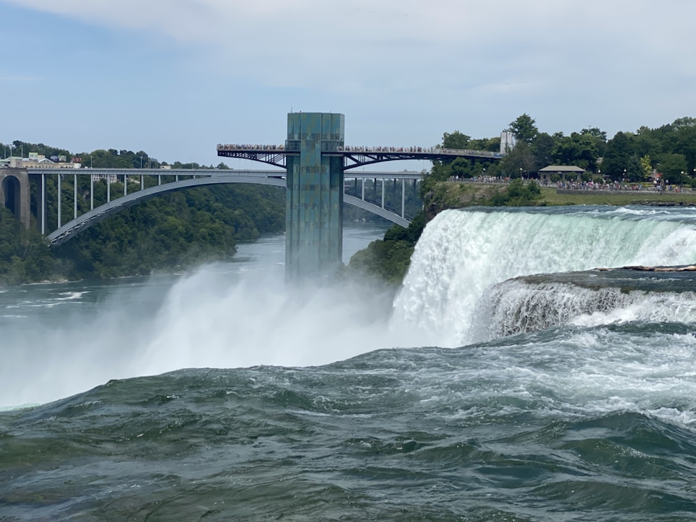 Des millions de litres d’eau perdent brutalement de l’altitude et viennent s’écraser sur les rochers. Le spectacle est saisissant. Les deux chutes principales font un boucan du diable. Des milliers de touristes sont sur la berge. Les mouettes sont les seules à ne pas s’émouvoir du paysage. De l’autre côté, les Canada nous tend les bras.